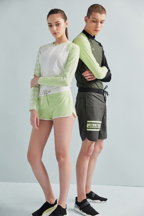 워터스포츠 컬렉션의 디자인은 해변의 로맨틱한 분위기와 뉴욕의 도시적인 감성을 조화롭게 살린 것이 특징이다. 질리지 않고 누구나 쉽게 소화 가능한 블랙과 화이트의 무채색을 중심으로 활용했으며 산뜻한 라임색과 올리브색, 파스텔톤의 핑크색으로 포인트를 줬다. 절제된 스프라이프 및 체크 패턴으로 현대적인 느낌을 강조했으며 경쾌한 정글 프린트를 뻔하지 않은 비대칭 디자인으로 풀어내 ‘질스튜어트 스포츠’만의 개성을 드러냈다.