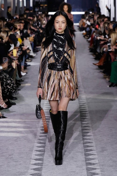 컬렉션 전반에서 보여지는 역동적인 에너지는 슈즈 제품에서도 뚜렷하게 나타난다. 패치워크와 강렬한 파이톤 프린트 가죽은 플랫폼 싸이-하이 혹은 앵클 길이의 플랫폼 부츠에 녹아 들어 구조적인 디자인과 여성스러움 모두를 갖췄다. 또한, 검정색 바이커 부츠는 관능적이고 화려한 드레스와 스커트에 매치되어 엣지를 더했다.