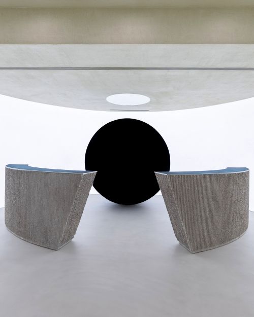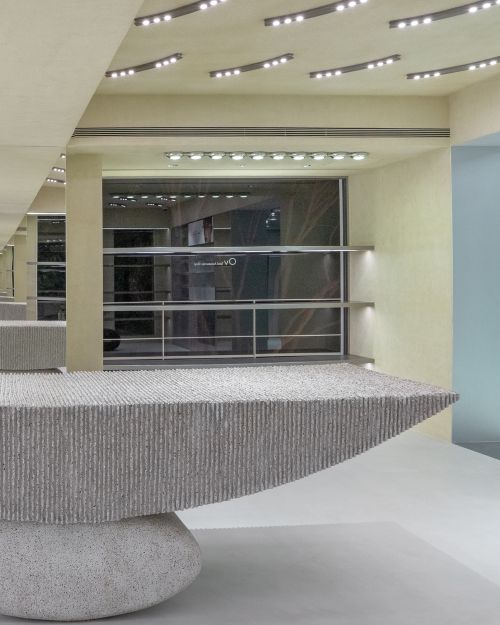 ‘아더에러’ 상하이 스페이스의 행거 하부에서는 다양한 소재와 기법으로 제작된 포디움을 찾아볼 수 있는데 이는 아더에러의 실험 정신을 기반으로 다양한 소재와 디자인을 다각도로 탐구하는 브랜드의 시그니처 집기 중 하나다. 아더에러 상하이 스페이스의 포디움은 콘크리트, 우드, 레진, 오간자, 자개, 옻칠, 스테인리스 스틸, 패브릭, 쿠션, 수세미 등 서로 다른 물성과 기법을 사용하여 제작되었으며 ‘아더에러’는 이를 통해 기존의 산업적 미학을 넘어 공예적 감성과 조형적 완성도로 브랜드의 미학을 확장했다.