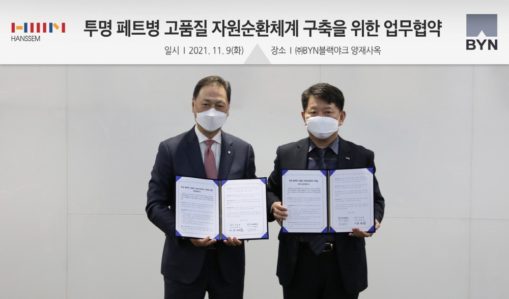 비와이엔블랙야크가 홈 인테리어 전문 기업 한샘과 국내 투명 페트병 고부가가치 자원순환을 위한 MOU를 체결했다.