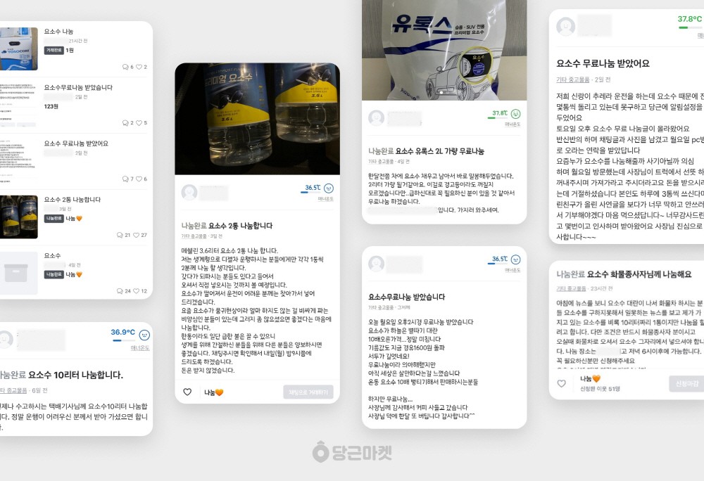 당근마켓은 가이드라인을 통해 요소수 부족으로 어려움을 겪고 있는 주변 이웃들을 위해 나눔 등의 활동으로 도움을 전하는 많은 이용자들에게 감사의 인사를 전했다. 실제 당근마켓에는 요소수 사태가 일면서 화물기사 분들에게 요소수를 무료로 나눠주거나 저렴하게 제공하려는 주민들의 자발적인 참여가 이어지고 있다.