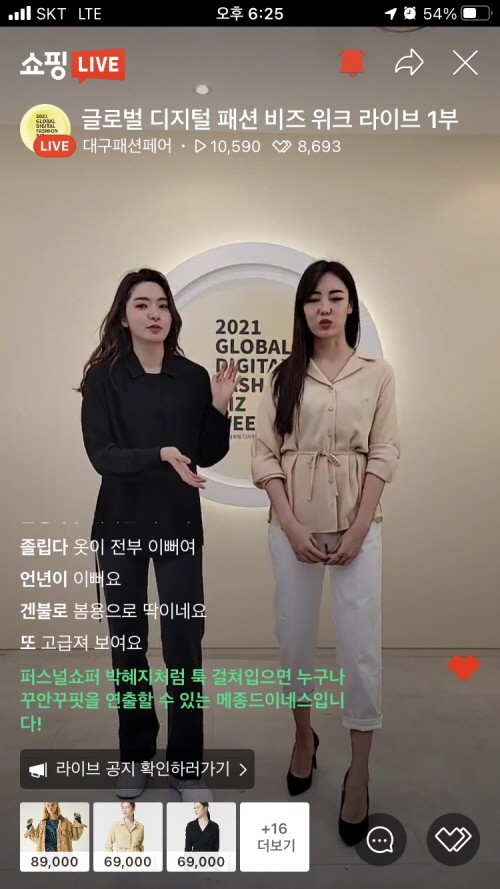 행사 마지막 날인 11월 19일에는 11시, 15시, 18시 총 3회에 걸쳐 네이버 쇼핑라이브 대구패션페어 채널을 통해 대구 지역의 패션업체 6개사(상민, 프롬스무드, 모던에이블, 두마딴, 리엘바이이유정, 스튜디오다리)의 제품을 소개한다.