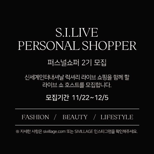 지원은 에스아이빌리지 내 2022 퍼스널쇼퍼 모집 페이지를 통해 가능하며 12 5일까지 지원서 양식과 함께 간단한 자기소개 및 에스아이빌리지 입점 브랜드를 소개하는 2분 내외의 영상을 찍어 접수하면 된다. 1차 합격자는 패션 혹은 뷰티 카테고리 중 랜덤 주제를 바탕으로 한 실전 라이브 방송 테스트가 진행되며 이후 최종 면접을 거쳐 최종 합격자를 선발할 예정이다.