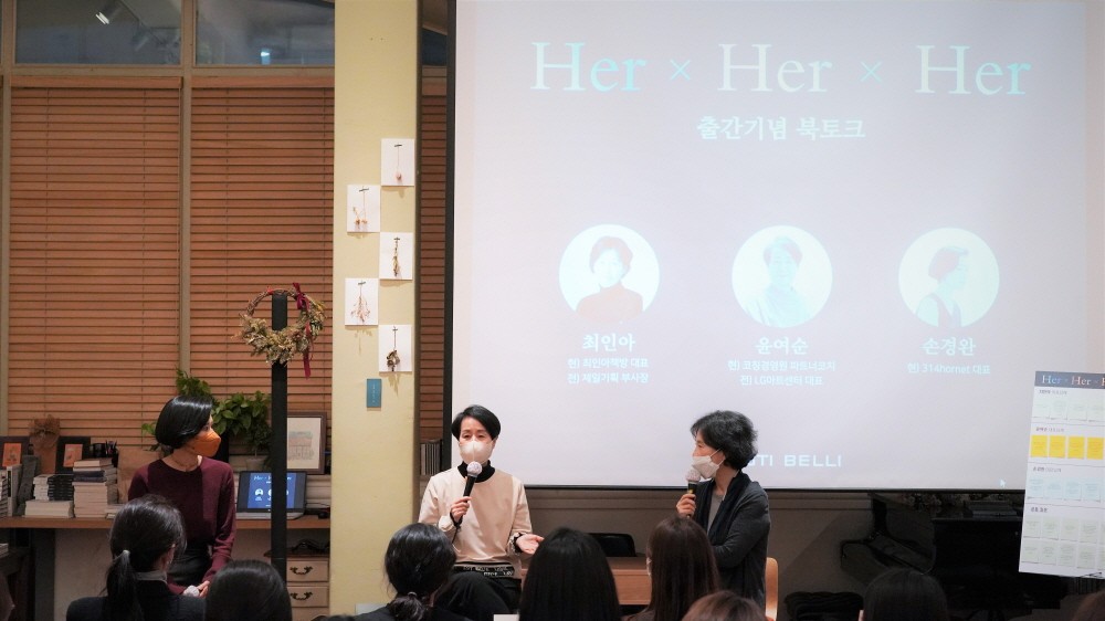 이번 북토크는 인터뷰집 ‘Her x Her x Her’ 책 소개부터 Q&A 시간, 사인회 순으로 진행됐다. Q&A 시간에는 행사 시작에 앞서 미리 받았던 질문지를 통해 여성 프로 3인의 답변을 들으며, 독자들의 궁금증을 해소할 수 있는 시간과 호흡하는 자리를 완성해 큰 호응을 얻었다.