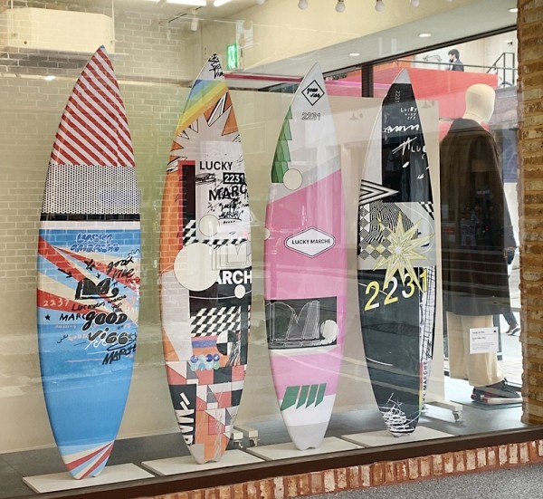 ‘럭키마르쉐’는 아티스트와 협업한 첫 아트워크를 성수동 플래그십 스토어에 공개했다. 이번 아트워크 프로젝트에는 MZ세대가 열광하는 영 아티스트 페인터 김영진을 선정했다. 김영진 작가는 직관적으로 보이는 동시에 복잡하고 미묘한 세계처럼 느껴지는 작품을 선보인다. 특히 캔버스를 벗어나 다양한 매체를 활용함으로써 그림이 담기는 방식에도 한계가 없는 작업을 하는 것으로 유명하다. 김영진 작가는 ‘럭키마르쉐’의 브랜드 아이덴티티인 긍정적이고 액티브한 분위기를 시각적 언어로 표현해냈다. 총 네 개의 서프보드를 활용해 하루를 구성하는 아침, 낮, 저녁, 밤을 각 시간대의 색감으로 표현했다.