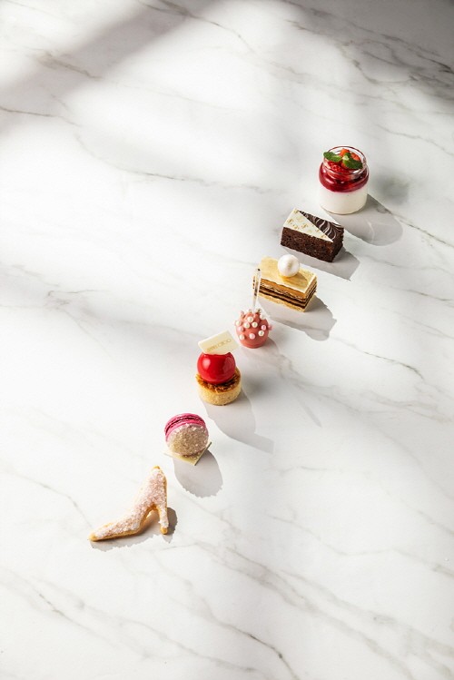 ‘지미추 갤러리 애프터눈 티 세트’는 ‘지미추’의 시그니처인 하이힐을 표현한 쿠키, 루비 초콜릿 롤리 팝, 캐러멜 초콜릿 오페라 케이크, 산딸기 크림 타르트, 다크 초콜릿 케이크, 그리고 딸기 판나코타 등이 메인 스위트로 구성되어 있다. 메인 스위트들의 모양, 질감 그리고 색감은 시각적으로 지미추와 연말이라는 테마를 조화롭게 어우르는 것이 특징이다.