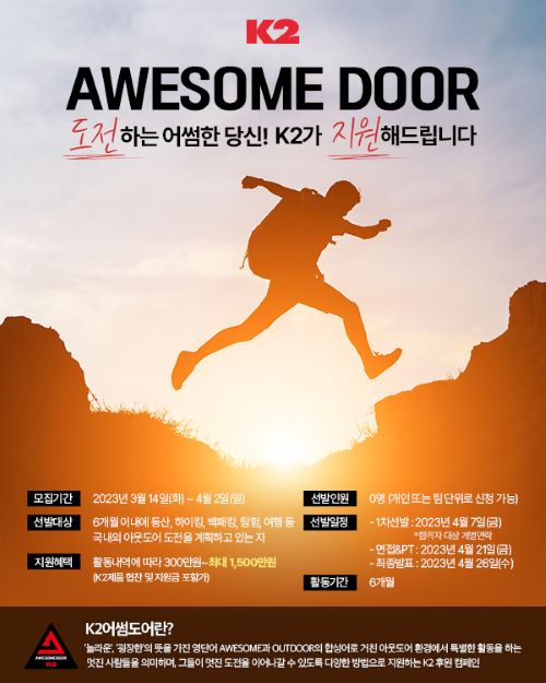 ‘K2’ 어썸도어는 굉장한의 뜻을 가진 영단어 어썸과 아웃도어의 합성어로 2014년부터 지금까지 30팀의 도전을 후원해왔다. 등산 에반젤리스트 김섬주, 다큐멘터리 PD 김진만 등 다양한 분야의 어썸도어들이 K2와 함께 멋진 도전을 이뤘다.