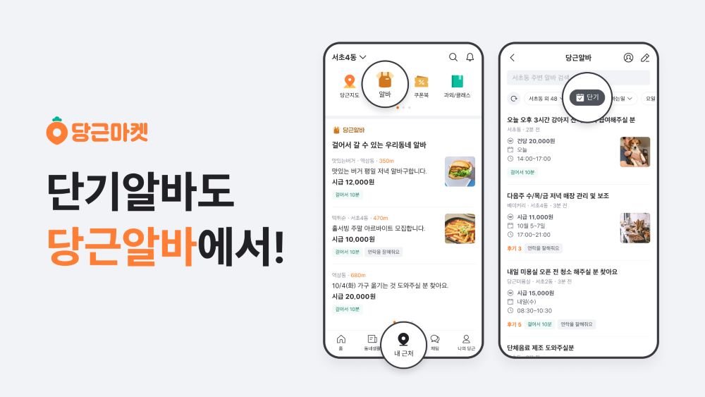 단기알바 일자리는 내 근처 탭 > 알바로 들어가 상단의 단기알바 필터를 선택하면 관련 일자리들을 한눈에 볼 수 있다. 반대로 일손을 필요로 하는 경우 알바 서비스 메인 페이지 우측 상단의 글쓰기 버튼을 누르고 근무 유형을 단기로 선택하여 구인 공고 게시글을 올리면 된다.