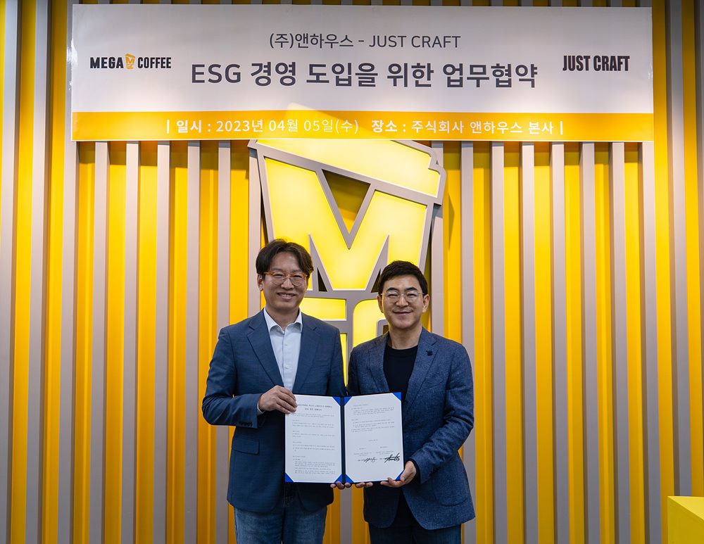 리오홀딩스가 앤하우스의 메가MGC커피와 ESG 경영 강화를 위한 업무 협약을 체결했다.