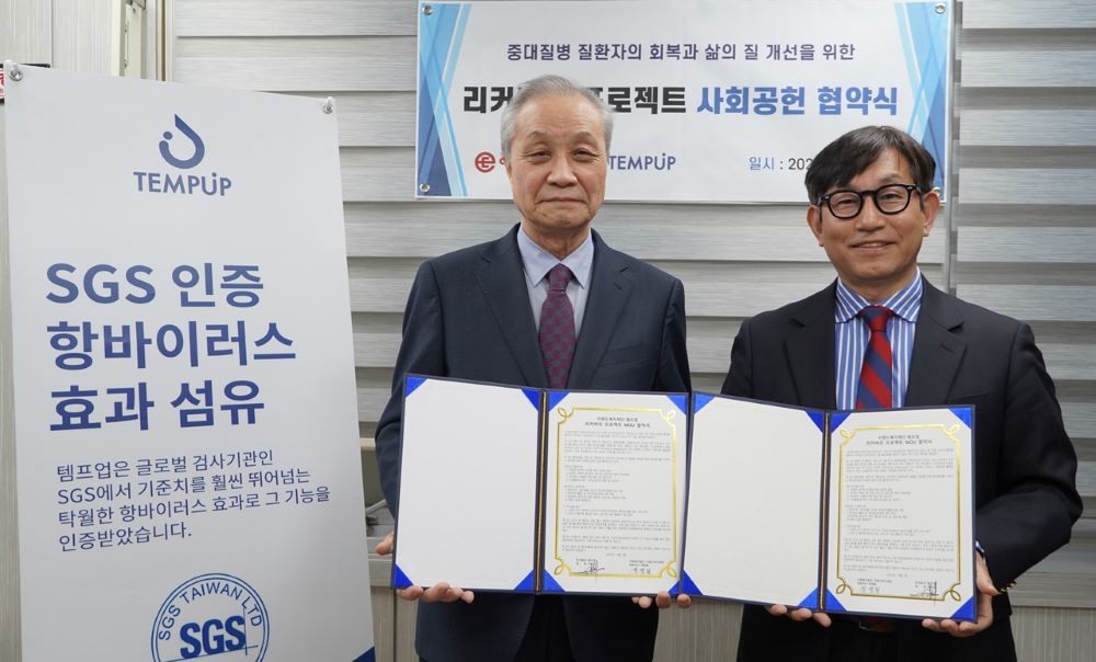 이날 협약식에는 이랜드복지재단 정영일 대표이사와 템프업 이규상 대표가 참석했다. 리커버리 프로젝트는 난치성 질환이나 원인불명의 질환으로 고통 받는 환우들을 대상으로 템프업의 기능성 건강관리용품 지원을 통해 건강과 삶의 질 개선을 지원하는 건강지원사업이다.