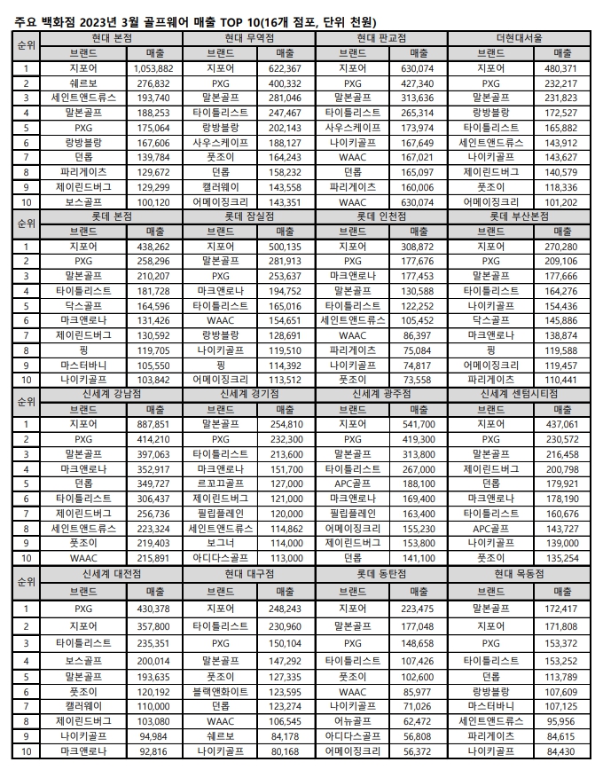 16개 백화점 3월 골프웨어 매출 TOP10