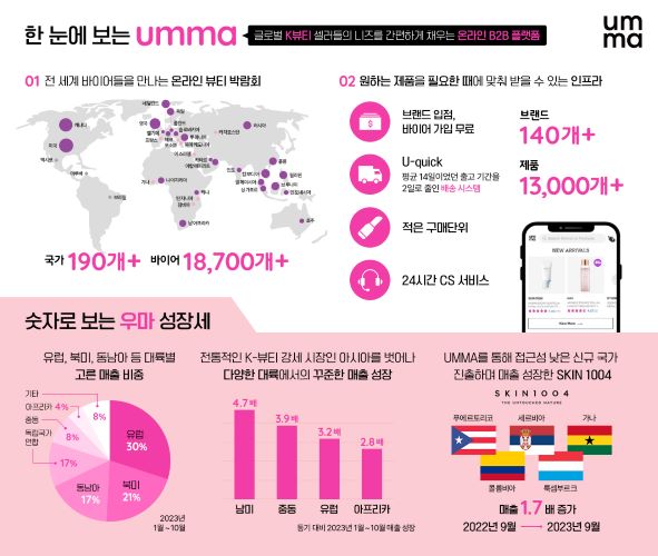 지난 2020년 런칭한 우마는 전 세계 190개 국가의 약 18,700명 이상의 바이어를 회원으로 보유한 B2B 뷰티 전문 커머스 플랫폼이다. K-뷰티의 주요 수요 국가들은 물론 가나, 탄자니아 등 아프리카 대륙과 코소보, 폴란드 등 유럽 지역에 이르기까지 폭넓은 B2B 네트워크를 보유, 인디 브랜드들이 추가 비용 없이 글로벌 채널을 구축하고 해외 소비자들의 반응을 살펴볼 수 있는 ‘온라인 뷰티 박람회’로 자리매김했다.