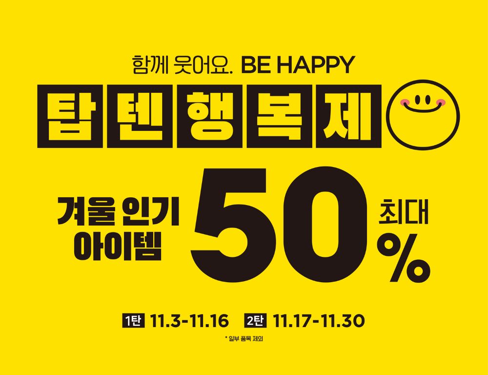 1탄과 2탄으로 나누어 오는 11월 30일까지 진행되는 행복제는 '함께 웃어요. BE HAPPY'를 슬로건으로 고객과 함께하는 좋은 순간, 좋은 옷을 전하기 위한 ‘탑텐’과 ‘탑텐키즈’의 선물같은 아이템들을 담았다.