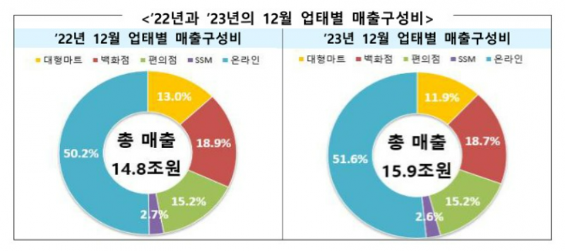 온라인 매출 비중은 전년 대비 1.3%P 증가하며 전체 매출의 절반을 넘긴 50.5%를 기록했으며 오프라인은 편의점(0.3%p)을 제외하고 대형마트(-0.7%p), 백화점(-0.7%p), 준대규모점포(-0.1%p) 모두 감소했다.
