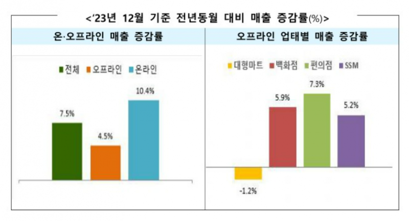 지난달 주요 유통업체 매출도 비슷한 흐름이다. 12월 매출은 오프라인(4.5%), 온라인(10.4%) 모두 증가하며 전체 매출은 전년 동월 대비 7.5% 상승한 15조9000억원이었다.