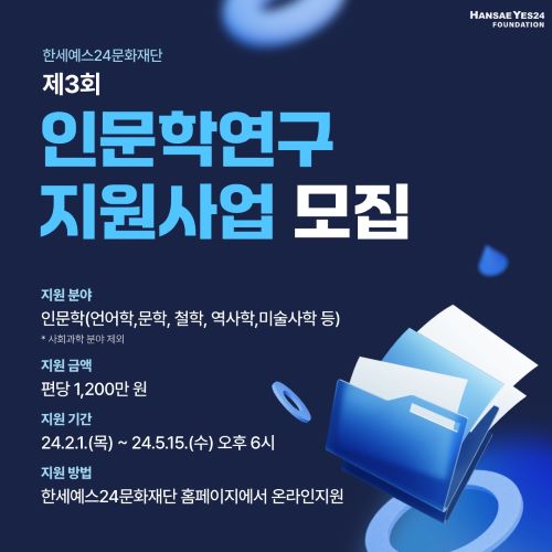한세예스24문화재단(이사장 백수미)이 오는 5월 15일까지 인문학연구지원사업 공모를 진행한다.