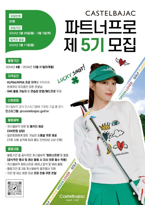 특히 이번 5기부터는 여성 프로도 선발할 예정이다. 5기 선발 인원은 총 20명이며 KPGA 또는 KLPGA 등록해 자격을 유지 중이면서 성실한 활동이 가능한 프로라면 누구나 지원 가능하다. SNS를 적극적으로 운영하거나 헤드프로인 경우 우대해 우선적으로 선발한다.