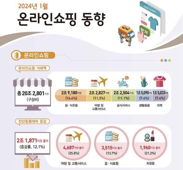 통계청이 발표한 2024년 1월 온라인쇼핑 동향에 따르면 새해 첫 달 온라인쇼핑 거래액은 20조 2801억원으로 집계됐다. 전년 동월 대비 2조1871억원(12.1%) 증가한 수치다.
