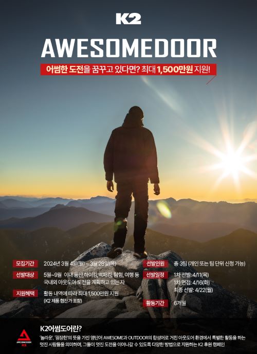 이번 어썸도어는 5월부터 9월까지 등산, 하이킹, 백패킹, 탐험, 여행 등 국내외 아웃도어 도전을 계획하고 있는 누구나 지원 가능하다. 개인 혹은 팀 단위로 총 3팀을 선발하며 최종 선발된 어썸도어는 활동에 따라 ‘K2’ 제품과 지원금을 포함해 최대 1,500만원까지 지원받게 된다.
