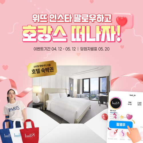 ‘위뜨’는 오는 5월 12일까지 고객 감사 프로모션으로 위뜨 인스타그램 팔로워 이벤트를 진행한다. 자세한 이벤트 내용과 참여방법은 위뜨 온라인 공식몰 및 공식 SNS 채널, 전국 오프라인 매장을 통해 확인 가능하며, 추첨을 통해 ‘소피텔 앰배서더 서울호텔 숙박권’ 등 푸짐한 경품을 증정할 예정이다.