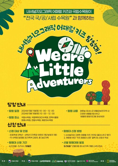 ‘내셔널지오그래픽 어패럴 키즈 탐험대’는 국립수목원이 주관해 프로그램을 개발하고 내셔널지오그래픽 어패럴 키즈의 후원으로 마련됐다. 이번 키즈 탐험대 시즌 2는 지난해 프로그램 참가자들의 높은 만족도와 성원에 힘입어 국립수목원 주관하에 전국 6개 국 공 사립 수목원에서 확대 진행된다. 시즌 2에 동참한 수목원은 국립수목원(포천)을 비롯해 ▲백두대간수목원(봉화) ▲영흥수목원(수원) ▲한밭수목원(대전) ▲한택식물원(용인) ▲해운대수목원(부산) 등 총 6곳이다.