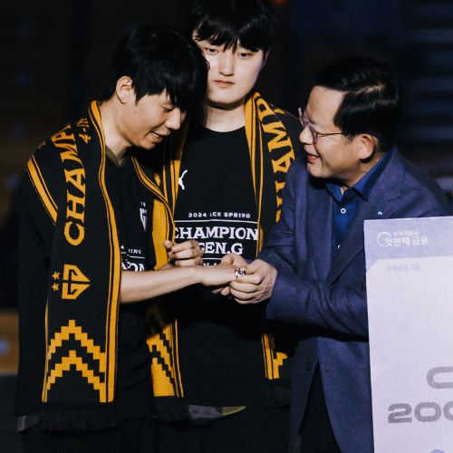 골든듀(대표 이필성)가 지난 14일 열린 세계 최고 이스포츠 대회 ‘리그 오브 레전드 챔피언스 코리아’ 2024 스프링 스플릿 결승전에서 우승한 젠지의 주장 리헨즈 손시우 선수에게 대표로 우승 반지를 수여했다.