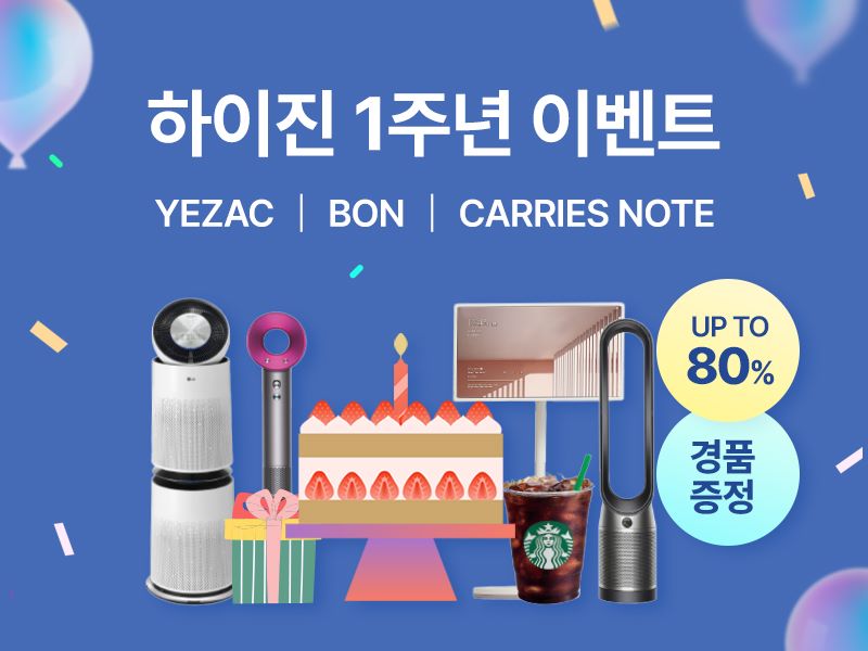 하이진닷컴은 런칭 1주년을 맞아 5월 3일부터 31일까지 다양한 프로모션으로 고객을 맞이할 예정이다. 하이진닷컴 웹사이트 또는 앱을 통해 매일 출석 시 1천 마일리지가 지급되며 10일 연속 출석할 경우 1만 마일리지를 추가 지급하는 개근상 이벤트가 진행된다. 구매 후 리뷰를 작성해준 고객 중 베스트 리뷰어(5명)를 선정하여 3만 마일리지를 지급하며, 게릴라성 파격특가 상품으로 요일별/시간별 다양한 상품을 준비하고 있다.