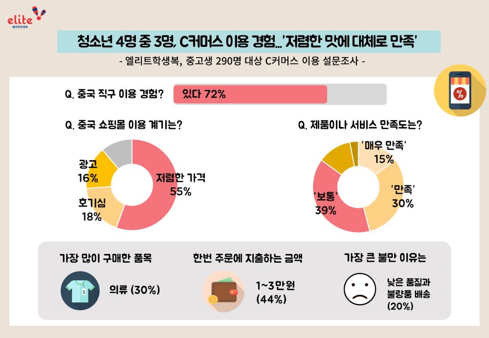 형지엘리트(부회장 최준호)가 지난달(4/18~4/28) 중고생 290명을 대상으로 C커머스 이용에 관한 설문 조사를 실시한 결과 72%가 중국 직구 쇼핑몰을 이용한 경험이 있다고 답했다.