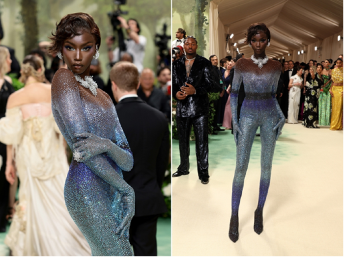 이번 멧 갈라의 주제는 ‘시간의 정원’으로 지오바나 엥겔버트는 소설가 J. G. 발라드의 단편 속 가든에서 영감을 받아 브랜드의 상징 컬러인 그린, 핑크, 옐로우, 블루, 화이트 총 5가지의 컬러와 129년의 역사를 자랑하는 ‘스와로브스키’ 정밀한 크리스털 세공 노하우를 접목하여 독특한 쿠튀르를 완성했다.