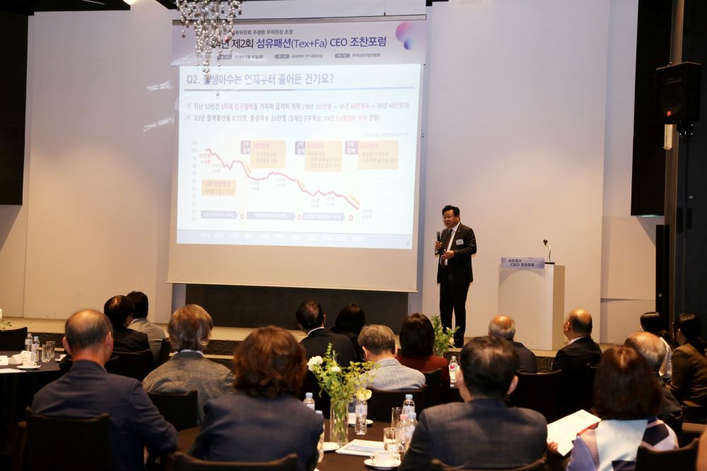 한국섬유산업연합회(회장 최병오)가 오늘(5월 30일) 한국 사회의 큰 위기로 닥쳐온 저출생 고령화 문제에 대한 섬유산업계의 대응책을 모색하기 위해 저출산고령사회위원회 주형환 부위원장을 초청, 섬유패션기업 CEO를 대상으로 ‘2024년 제2회 섬유패션(Tex+Fa) CEO 조찬포럼’을 개최하였다.