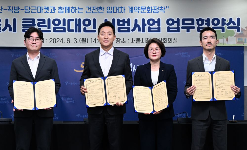각사는 이번 협약에서 서울시에서 새롭게 추진하는 ‘클린임대인’ 시범 사업 운영을 위해 협업하고 건전한 임대차 거래 문화 정착을 위해 △시범사업 추진과 활성화를 위한 홍보 △시범사업 관련 자료 및 정보 교류 등 다양한 영역에서 협력 관계를 이어나가기로 했다.