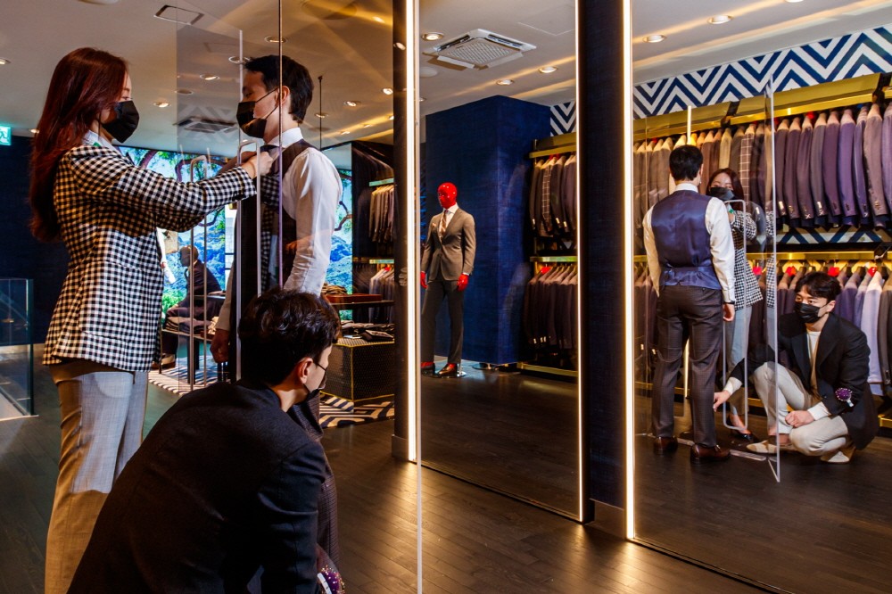 ‘수트서플라이’ 전문 스타일리스트는 세이프 스크린 앞에서 고객을 마주하며 스크린에 열려있는 작은 공간을 통해 재킷의 어깨, 허리 등의 피팅은 물론 팬츠의 통과 실루엣, 길이 등을 체크해 완벽한 핏을 찾아주는 서비스를 제공한다.