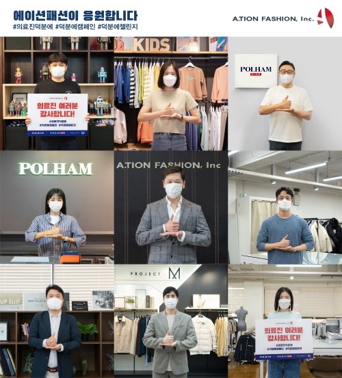 에이션패션이 전개하는 ‘폴햄’, ‘프로젝트엠’, ‘폴햄키즈’ 공식 SNS에는 #의료진덕분에 #덕분에캠페인 #덕분에챌린지 해시태그와 함께 ‘존경합니다’를 뜻하는 수어 동작의 모습을 담은 임직원들의 사진을 게재했다.