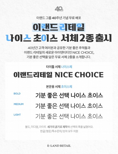 이랜드리테일은 그룹 창립 40주년을 맞아 자체 개발한 타이틀 전용 서체 ‘나이스체’와 본문 전용 서체 ‘초이스체’ 등 2종의 전용 서체를 오는 4일부터 이랜드리테일 홈페이지를 통해 무료 배포한다.