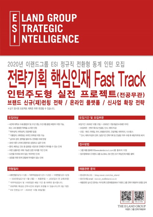 한편 이랜드그룹 전략기획본부 ESI는 이번 동계 인턴십 채용을 맞아 유튜브 온라인 채용설명회를 진행하고 있다. ESI 공식 유튜브 채널을 통해 배혜지 캐스터가 전하는 채용 소식과 지원 팁 등을 확인할 수 있으며 ESI 직무에 대한 자세한 내용은 ESI 블로그를 통해서도 확인할 수 있다.