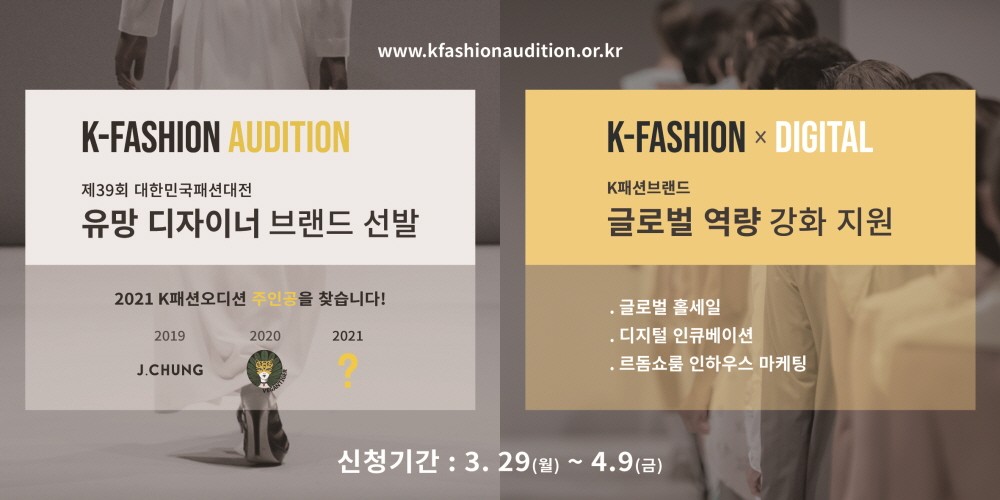2021년도 K패션오디션」과 K패션×디지털은 3월 29일부터 4월 9일 15:00까지 공식 웹사이트를 통해 참가 신청 가능하다.