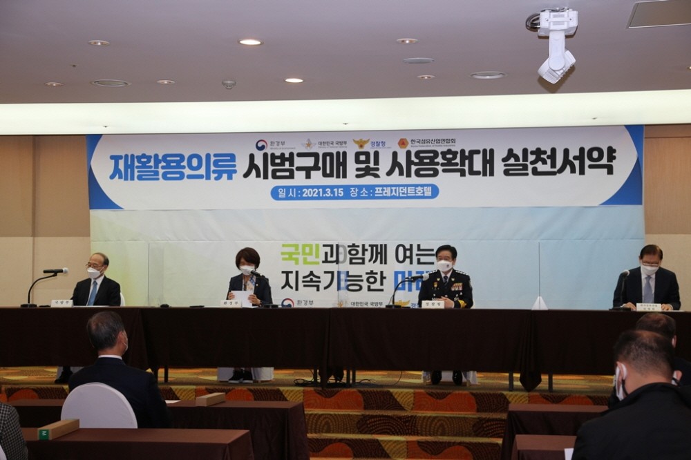 한국섬유산업연합회(회장 이상운)가 지난 3월 15일 서울 프레지던트 호텔에서 환경부와 국방부, 경찰청과 투명 페트병으로 만든 리사이클 의류를 시범 구매하는 자원순환 서약식에 참여했다.