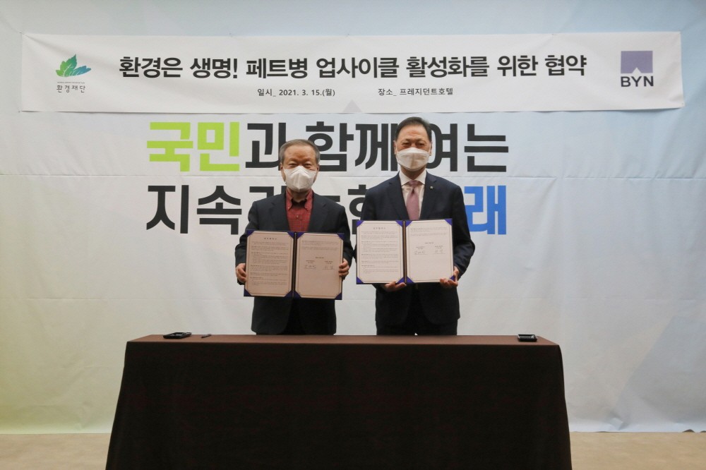 강태선 비와이엔블랙야크 회장이 지난 15일 환경재단 최열 이사장과 투명 페트병 고품질 재활용 및 지속 가능한 소비 체계 구축을 위해 업무 협약을 체결했다.