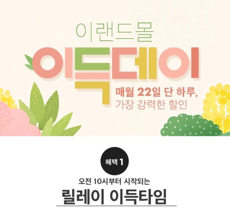 이랜드몰의 3월 이득데이는 시간대별 선착순 한정 특가상품과 쿠폰으로 구성된 이득타임, 인기 브랜드 상품을 최대 91% 할인가에 만날 수 있는 이득딜로 구성된다. 이득타임은 오전 10시부터 오후 9시까지 시간대별 할인 쿠폰과 특가 상품으로 구성된다.