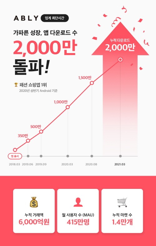 에이블리에 따르면 지난해 3월 누적 다운로드 수 1000만 돌파에 이어 1년만에 2000만 건을 넘어섰다고 밝혔다. 이는 전년 동기 대비 2배 이상 증가한 수치로 업계에서 가장 빠른 성장세를 보이고 있다. 누적 거래액은 6000억원을 달성하며 지난해보다 약 350% 증가했다.