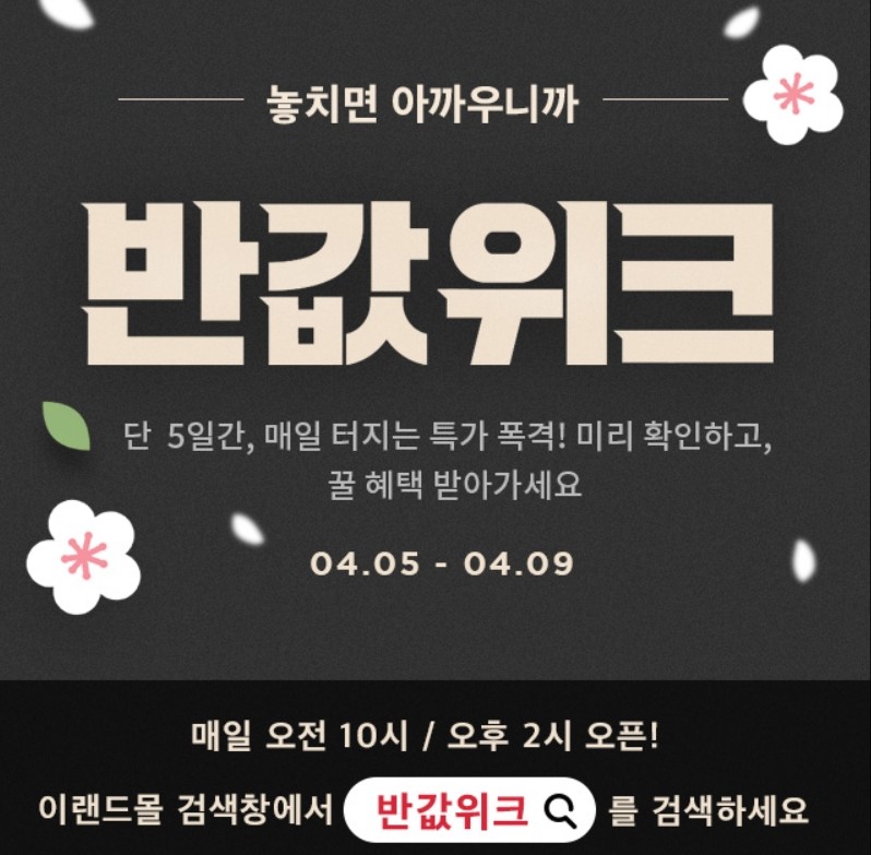 이랜드몰의 반값위크는 5일부터 9일까지 진행되며 매일 인기브랜드 반값쿠폰, 선착순 반값상품, 극한특가까지 다채로운 이벤트를 선보인다.