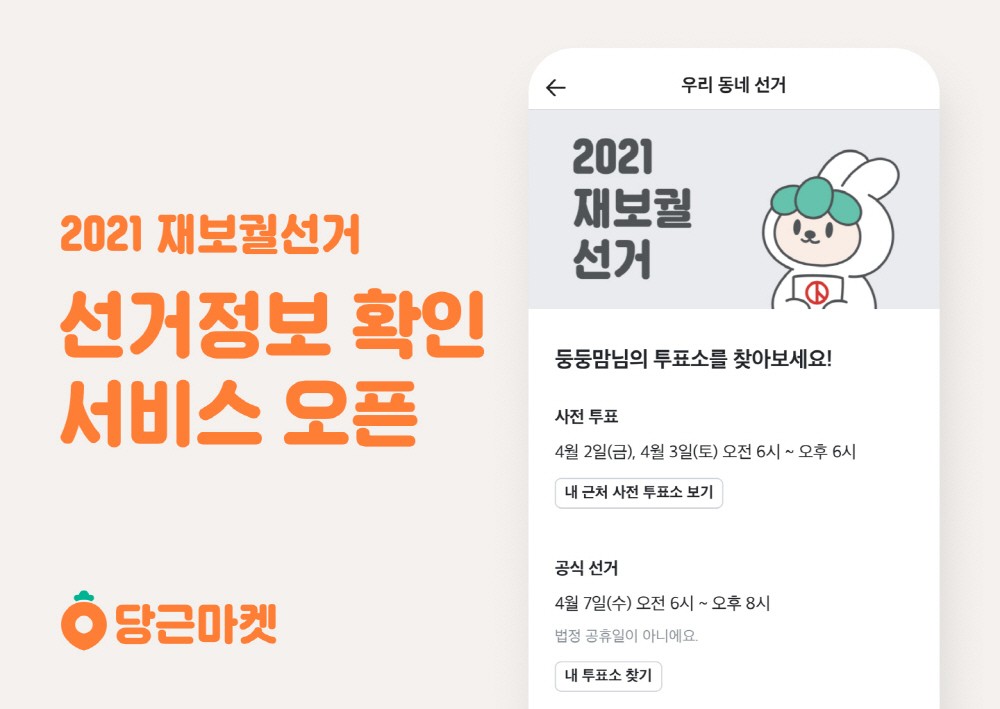한편 당근마켓의 이번 2021 재보궐 선거 투표 참여 안내는 지난해 제21대 국회의원선거에 이은 두 번째 기획으로 지역 사회의 올바른 선거문화 활성화를 위한 노력의 일환으로 진행했다.