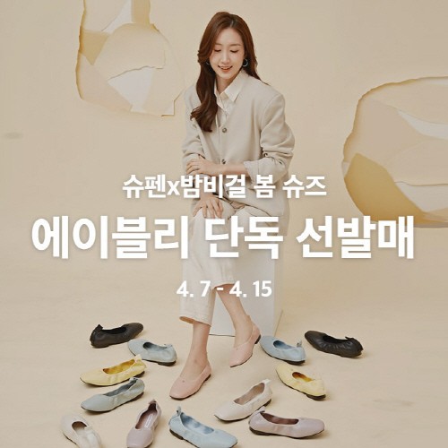 에이블리는 이번 ‘슈펜’과 밤비걸 콜라보레이션 제품을 단독 선발매하며 15일까지 다양한 할인 프로모션을 진행한다. 밤비걸 플랫과 로퍼를 포함한 슈펜 전상품을 10% 할인가에 선보인다. 밤비걸 전용 쿠폰 이벤트도 진행해 ‘밤비걸이쏜다’ 쿠폰 코드를 입력하면 즉시 사용 가능한 7천원 할인 쿠폰도 제공한다.