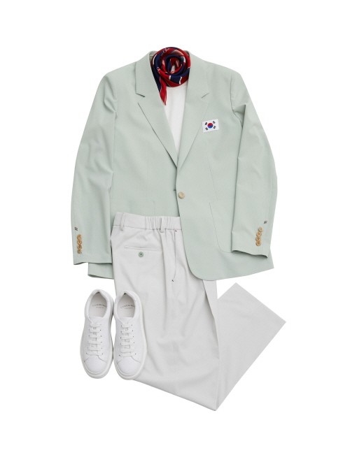 팬츠는 조선 백자의 순백색으로 디자인했다. 마찬가지로 와플 모양의 조직감이 있는 기능성 원단을 사용하여 구김을 최소화했으며 청량감도 더했다. 남성 선수에게는 태극의 붉은 색과 푸른색을 따온 스트라이프 넥타이를, 여성 선수에게는 태극의 컬러에서 모티브를 따온 스카프를 제안했다. 무더운 햇살을 막아주기 위한 파나마 햇도 함께 제공한다.