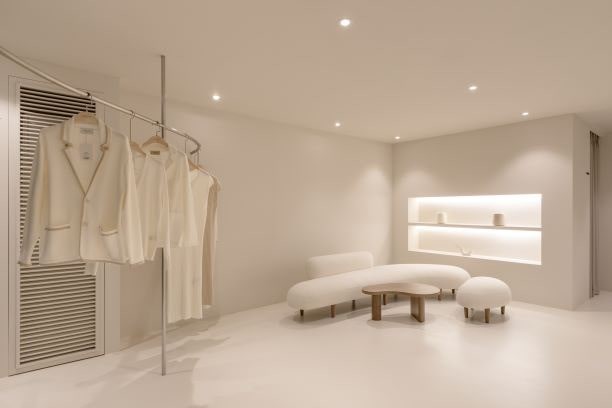 청담 플래그십 스토어는 층당 약 66㎡(20평) 규모로 총 2층으로 구성되어 있으며 1층 여성컬렉션과 2층 남성컬렉션을 만나 볼 수 있다. 공간은 화이트를 활용하여 모던하고 심플함을 기본으로 벽면의 니팅소재를 활용한 다양한 오브제들이 브랜드의 아이덴티티를 표현한다. 2층의 거대한 곡선 형태의 가구들은 전체적인 공간의 무드를 편한하게 만들어줘 여유로운 쇼핑을 할 수 있다.