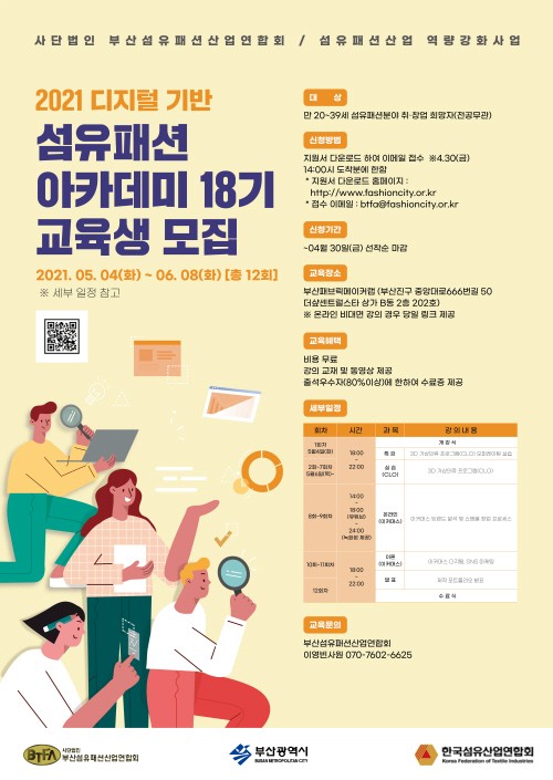 부산섬유패션산업연합회가 4월 12일부터 4월 30일 까지 2021 디지털기반 섬유패션 아카데미 18기에 참여할 교육생을 모집한다.
