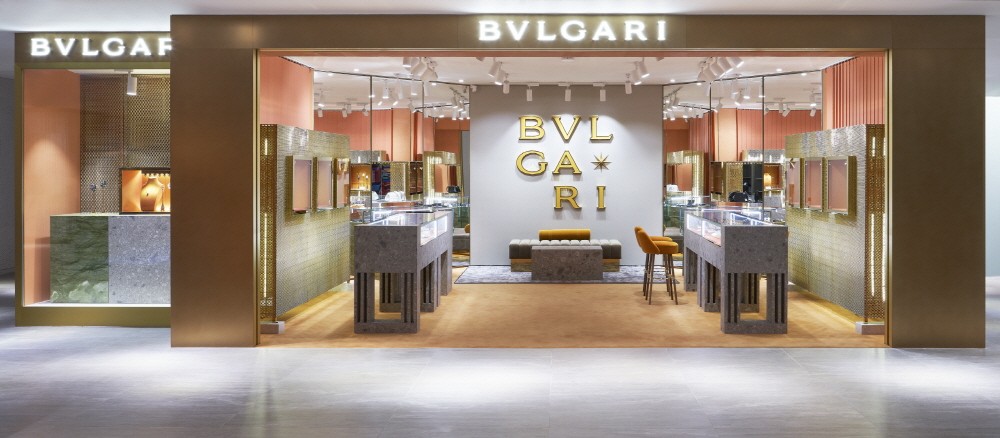 내부 인테리어 또한 스토어 컨셉에 맞춰 보다 젋고 현대적인 감각을 강조했다. 넓고 탁 트인 매장 입구를 지나면 브랜드 시그니처 컬러인 샤프론 컬러로 꾸며진 내부가 로마의 따스한 태양을 연상시키고 시선을 사로잡는 로마자의 ‘불가리’ 맥시 로고 레터가 로마적인 DNA와 모던함을 선사한다. 또한 이 컬러풀한 공간과 조화를 이루는 대리석, 브라스 및 실크 등의 고급 소재의 디스플레이 요소들을 통해 불가리의 독창적인 면모를 발견할 수 있다.