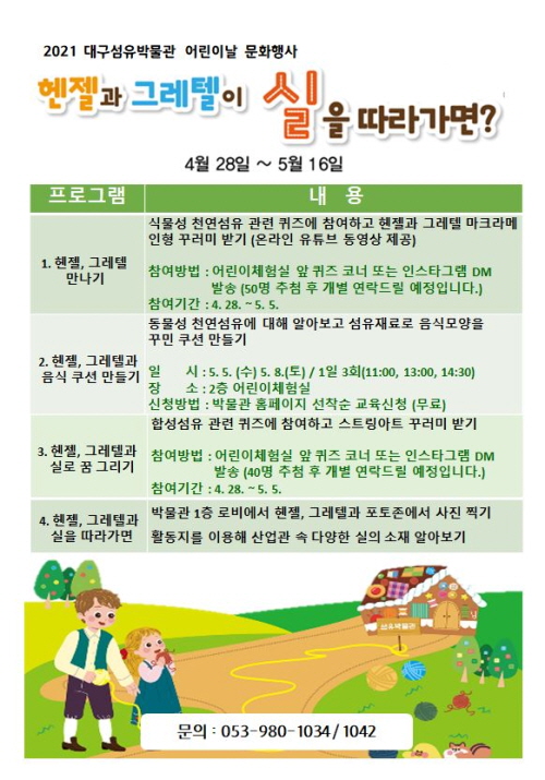 대구섬유박물관이 4월 28일부터 5월 16일까지 어린이날 문화행사 ‘헨젤과 그레텔이 실을 따라가면’을 진행한다.