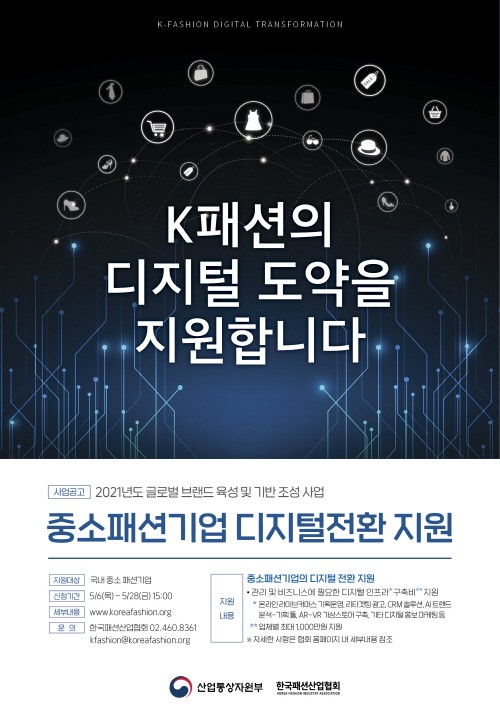 한국패션산업협회(회장 한준석)가 글로벌 브랜드육성 및 기반조성 사업의 일환으로 중소패션기업의 디지털전환 지원 사업 희망 업체를 모집한다.