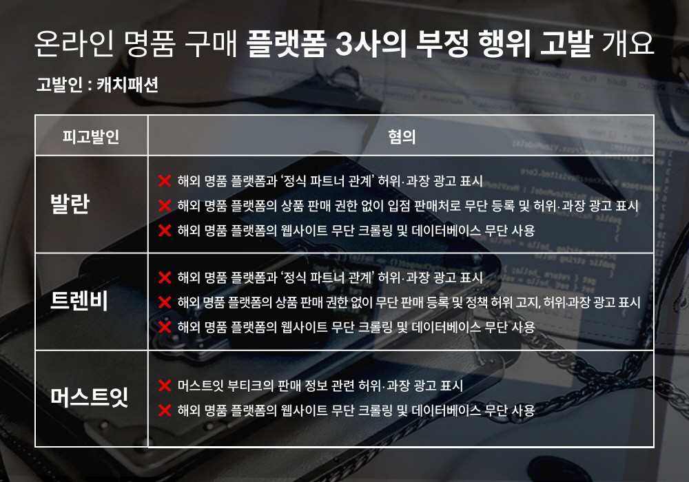 캐치패션측은 고발 대상 업체드은 병행수입 및 구매대행의 구조를 포함한 명품 쇼핑 플랫폼으로 병행수입 및 구매대행 셀러들을 위한 마켓 플레이스를 제공하거나 직접 병행수입에 뛰어들어 상품을 확보, 재판매하기도 한다. 이러한 플랫폼에서 판매되는 명품 상품들은 가품 논란으로부터 100% 자유로울 수 없는 구조이기 때문에 명품 구매 결정 요인으로 우선시되는 정품 보장을 어필하기 위해 플랫폼들의 과도한 부정 경쟁 행위가 이뤄지고 있다고 주장했다.